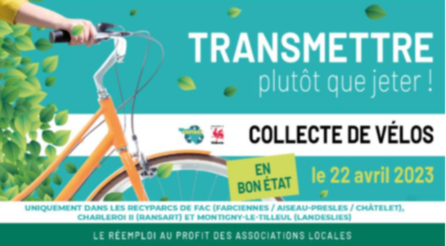 Chaque année, les intercommunales wallonnes de gestion des déchets organisent une collecte de vélos en bon état dans les recyparcs. Cette collecte a lieu le 22 avril 2023 sur 3 recyparcs différents. Les vélos collectés seront redistribués à des associations locales. Depuis 2007, plus de 57 000 vélos ont été remis en circulation grâce à cette initiative.